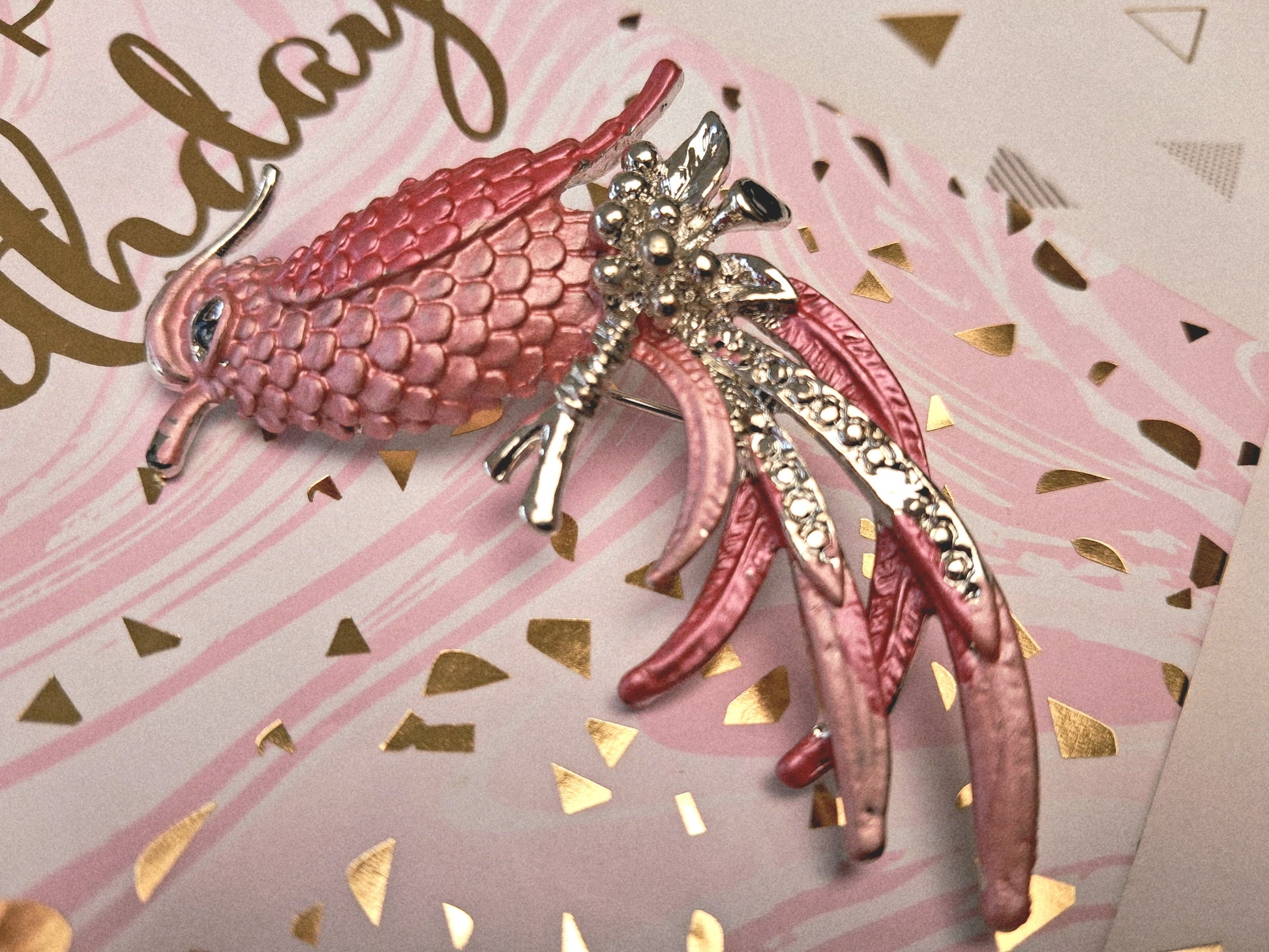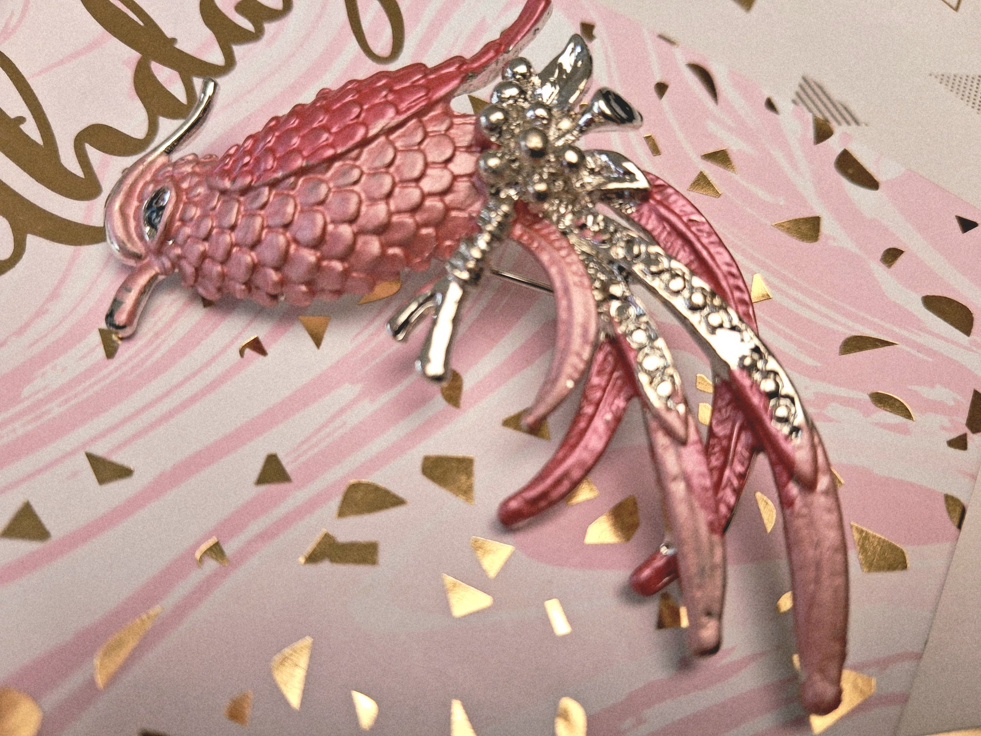 Broche métal oiseau des îles émaillée, nacrée, camaïeu de roses