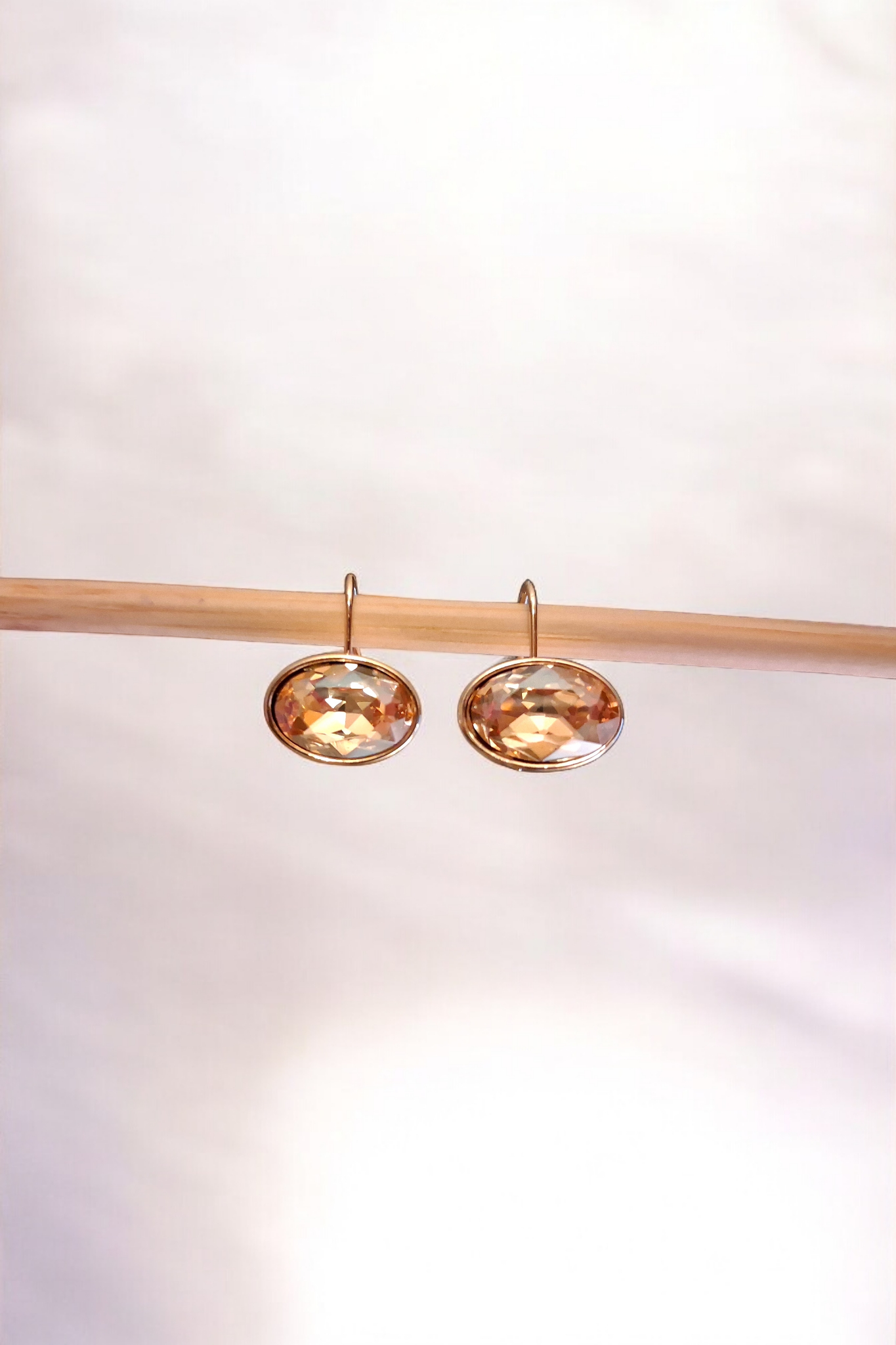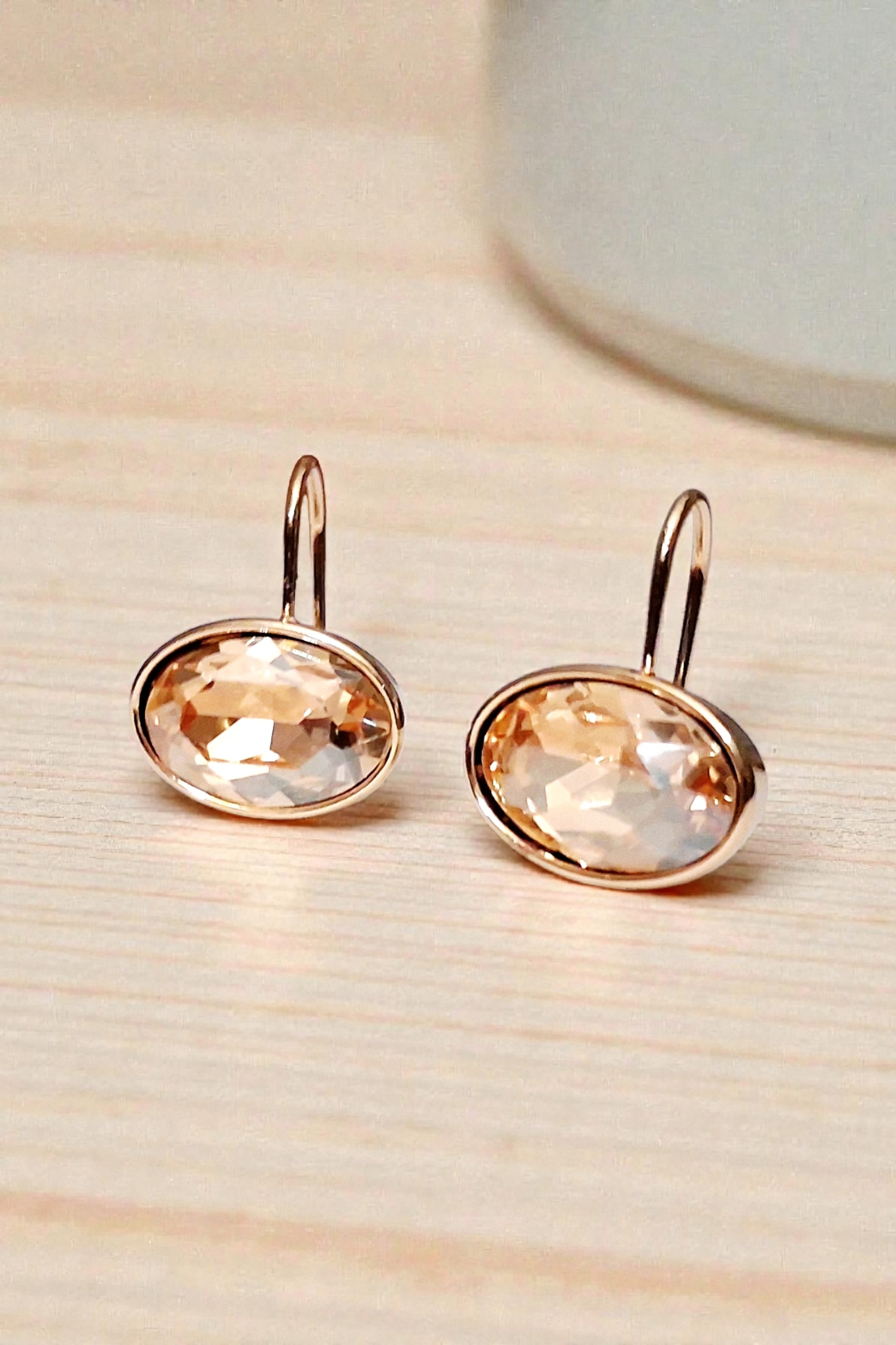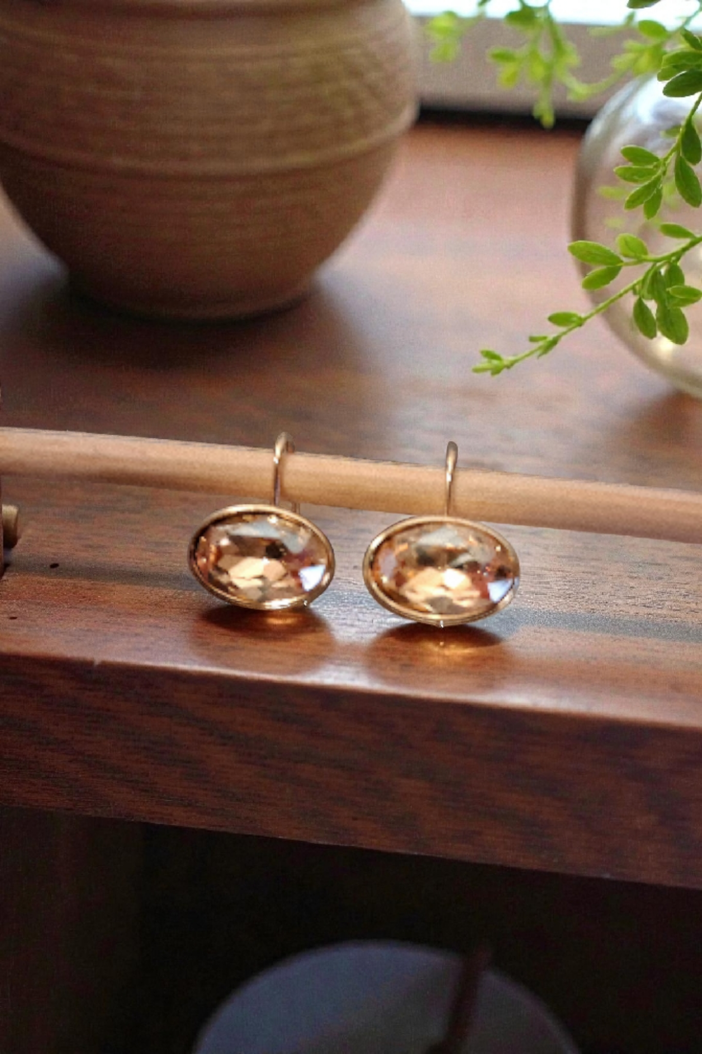 Elégantes et intemporelles, dormeuses ovales verre finement taillé bijouterie tons champagne rosé sur monture laiton doré éclatant.