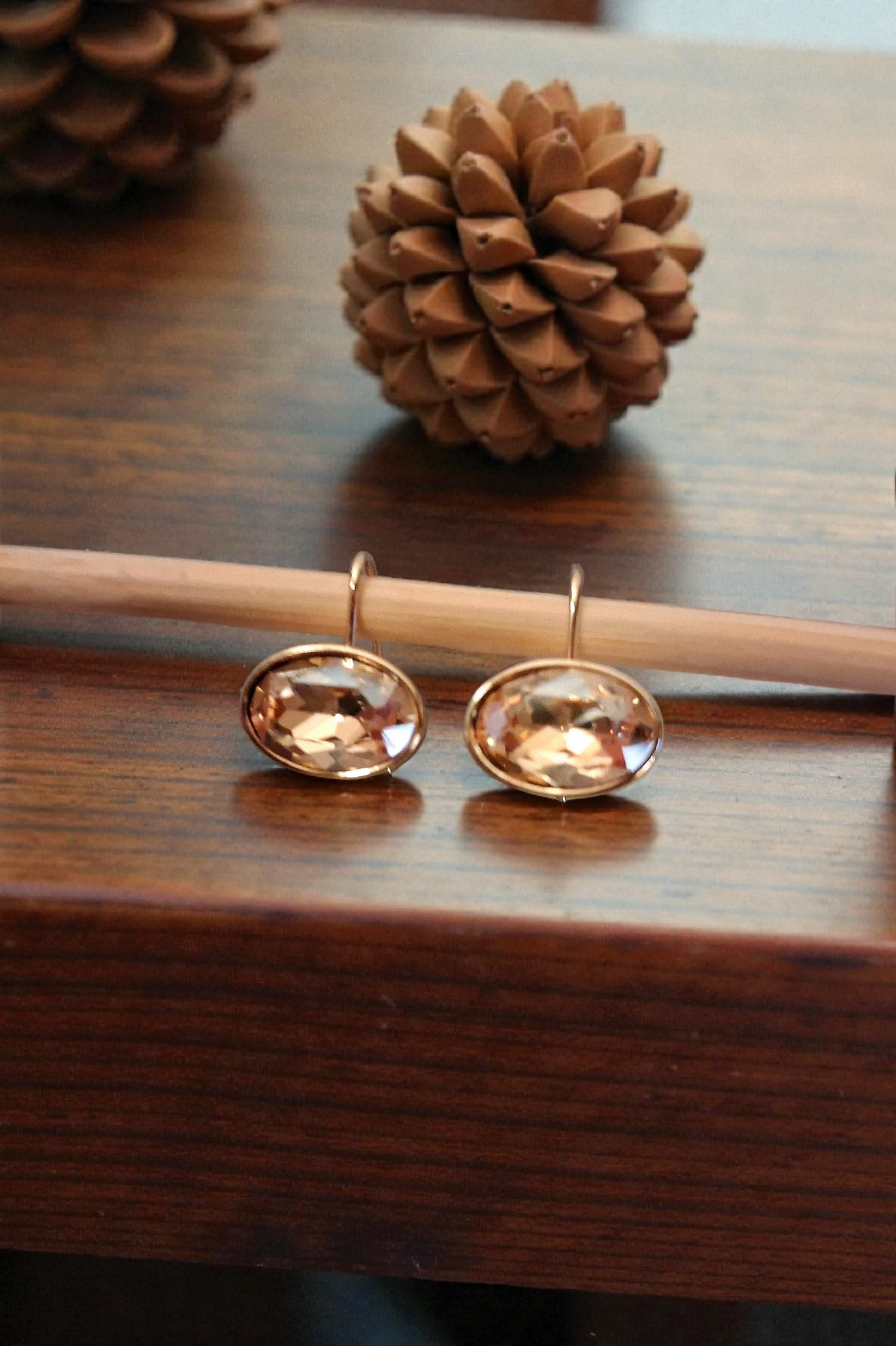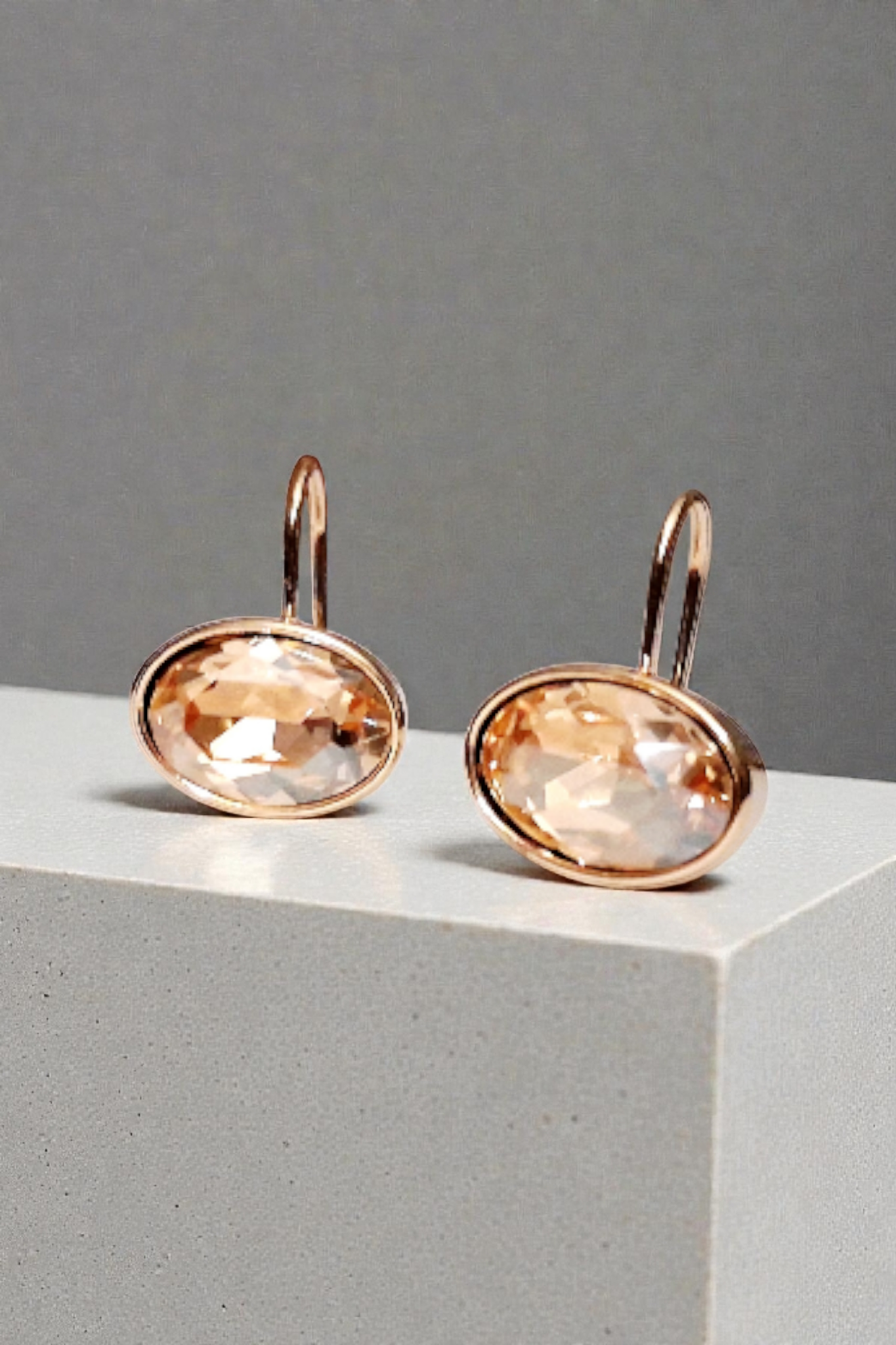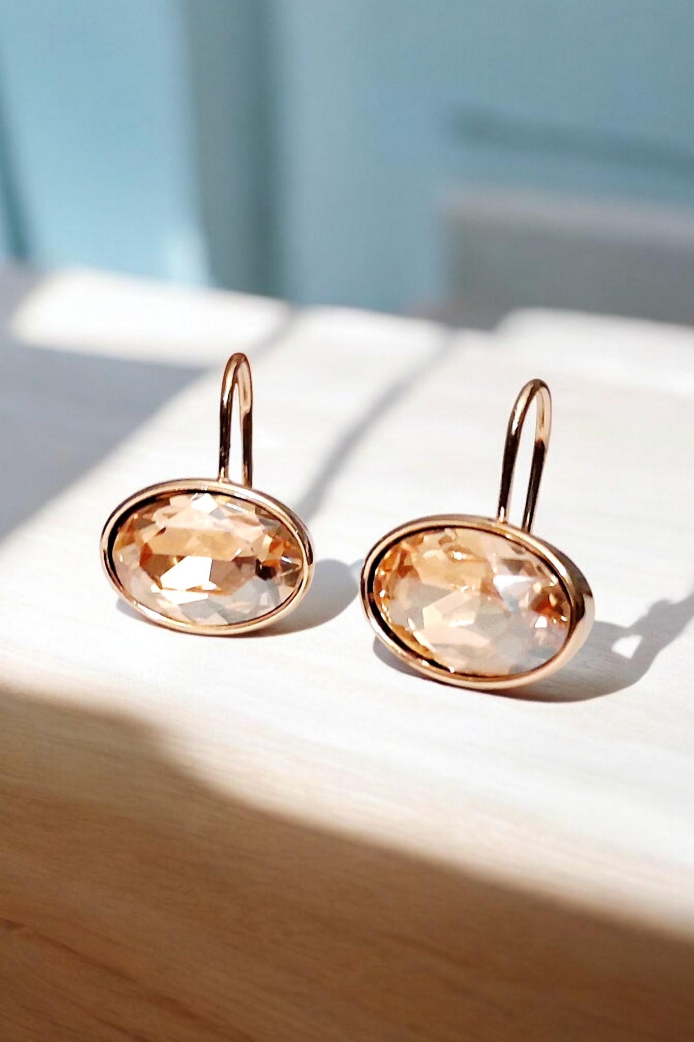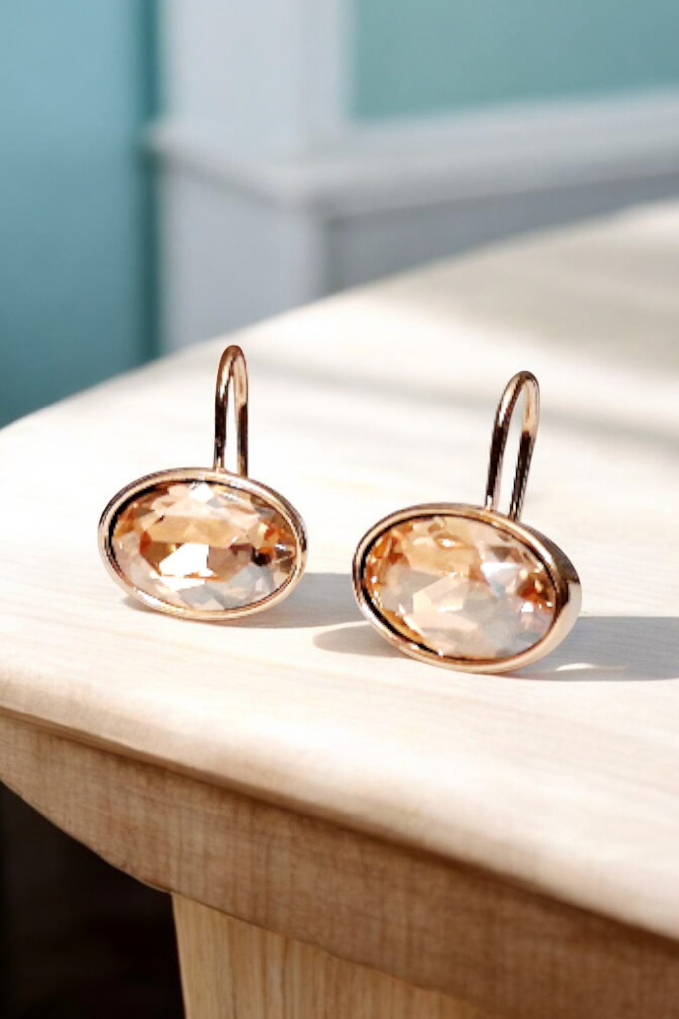 Elégantes et intemporelles, dormeuses ovales verre finement taillé bijouterie tons champagne rosé sur monture laiton doré éclatant.