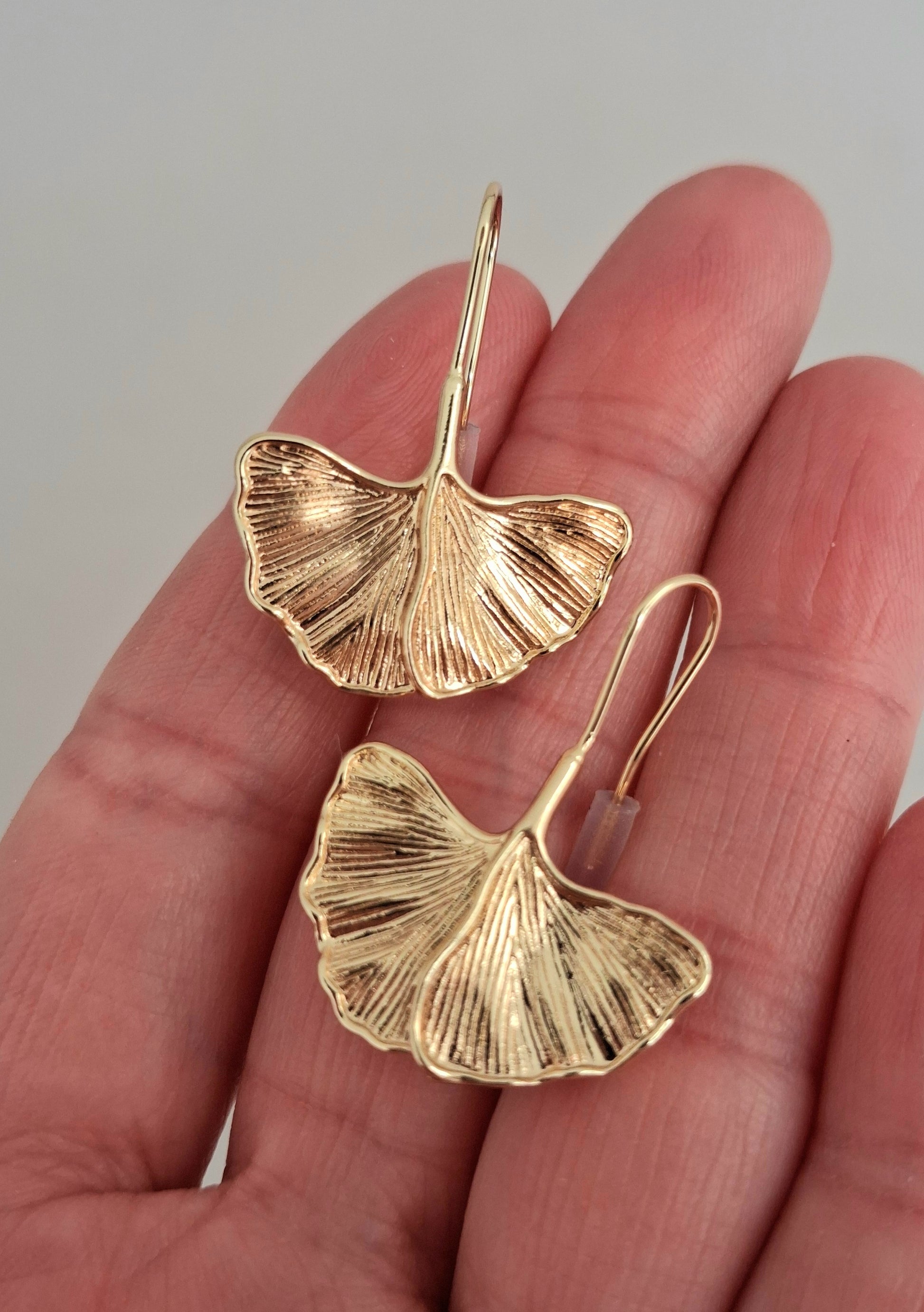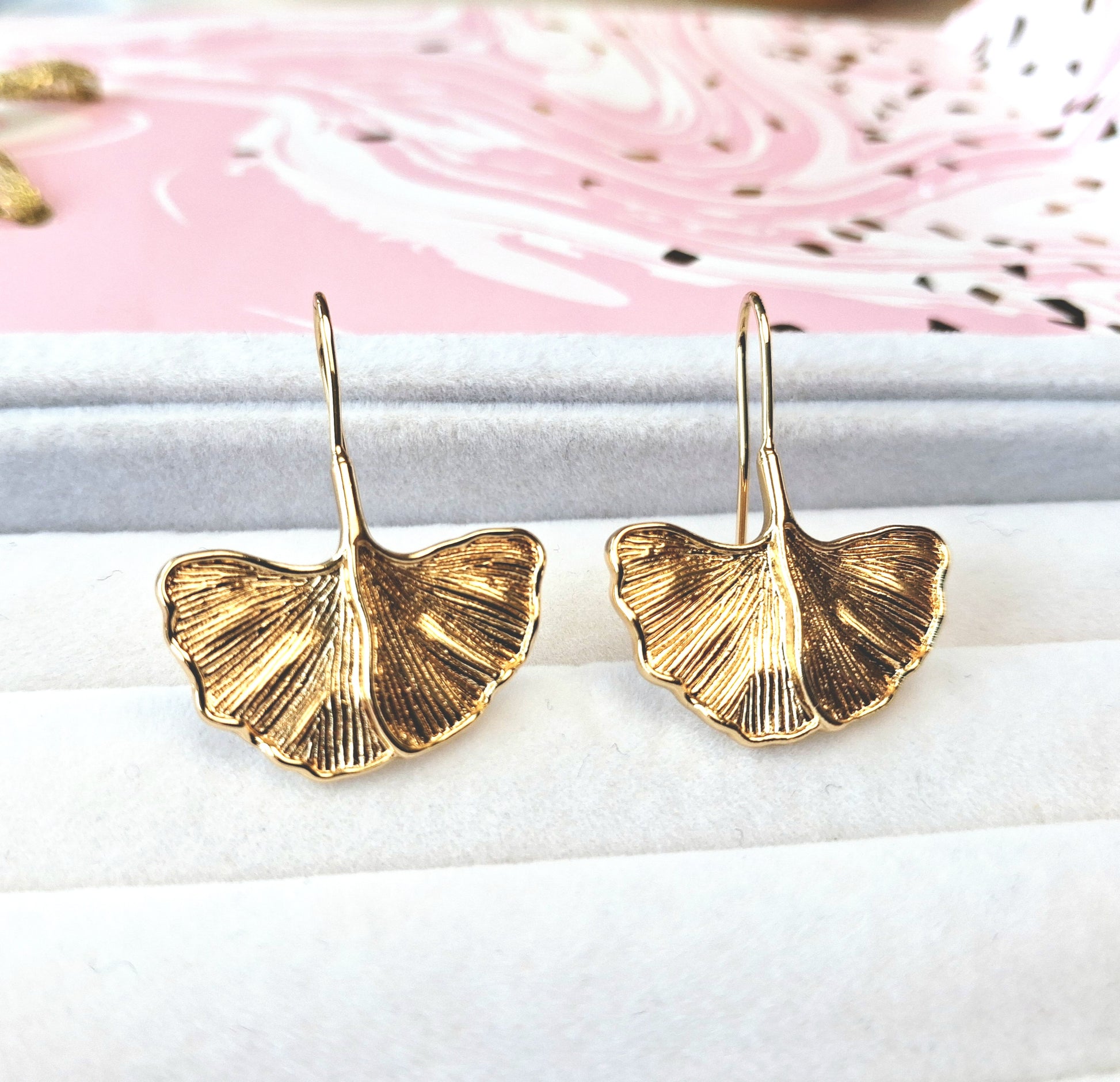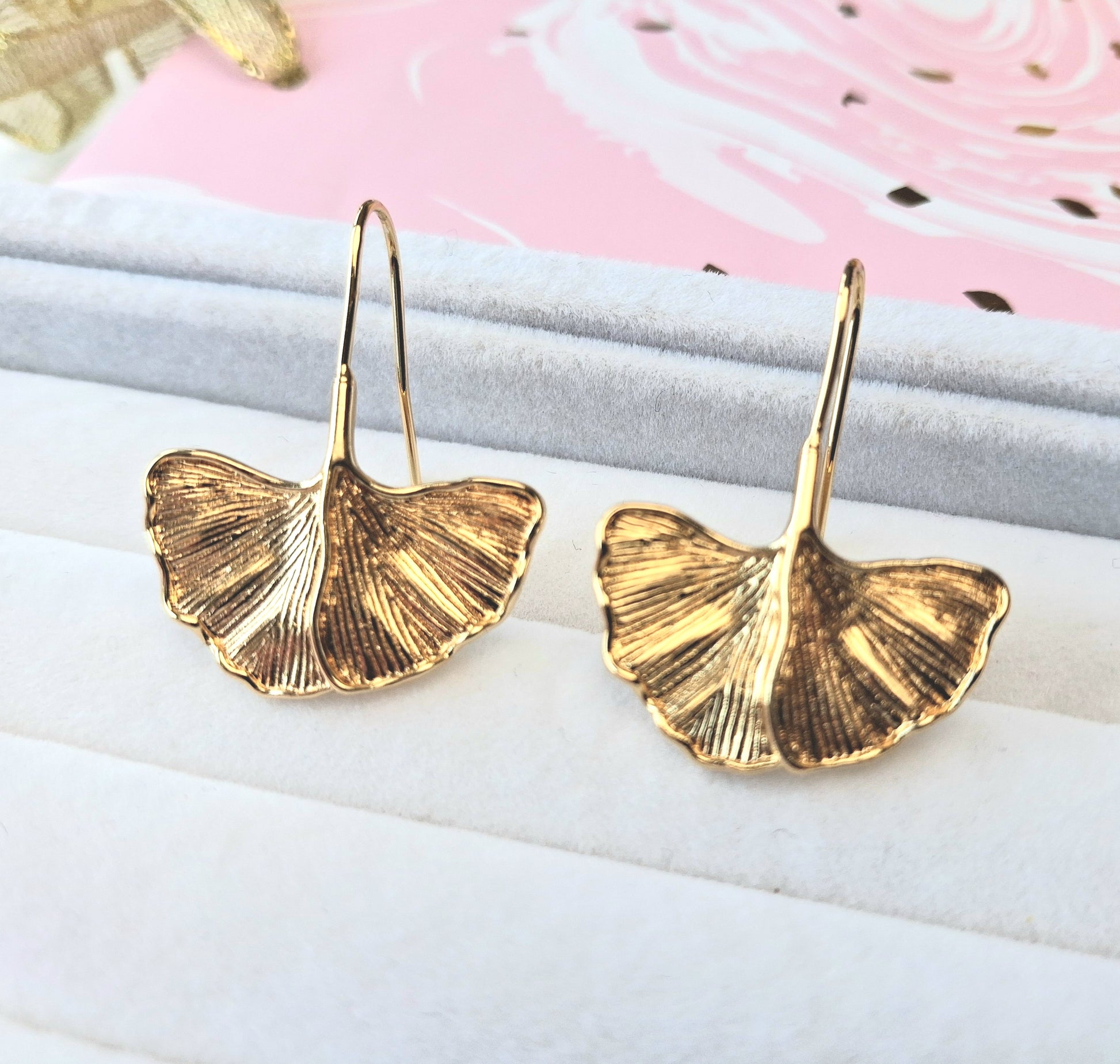 Dormeuses dorées à l'or fin 14K 1micron feuilles de ginko biloba.
